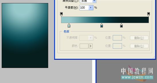 好了,建立好文档后,首先用径向渐变拉出如下图效果的背景~(我这里用的色值分别是:#97c9ca #0a4d56 #061e1e)
