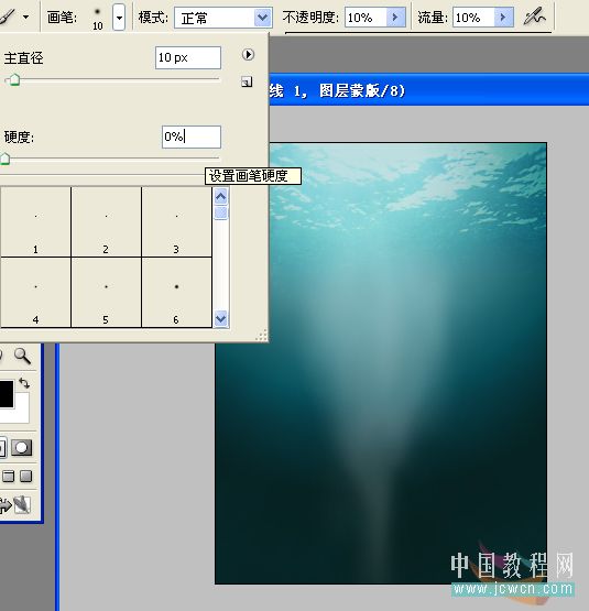 继续,新建一个图层,把前景色设置为白色,然后选择画笔,把硬度调小,画笔大小随意,画笔流量和不透明度都调到10%,然后画出如图效果