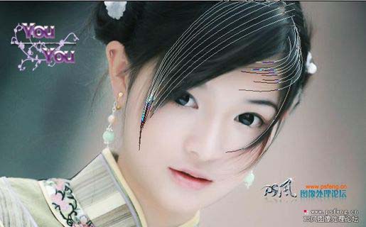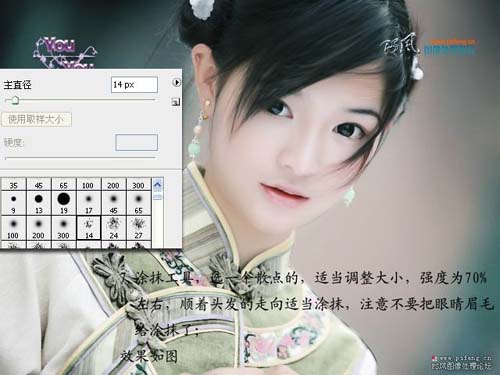 #p# 7、选择涂抹工具,选择一个散点的,适当调整大小,强度为70%左右,顺着头发的走向适当涂抹,主要不要把眼睛没报给涂抹了。