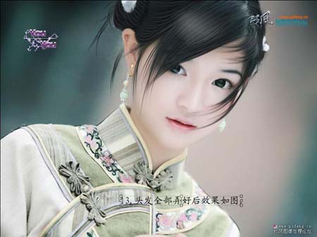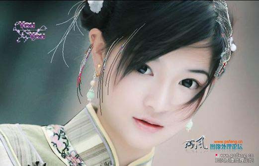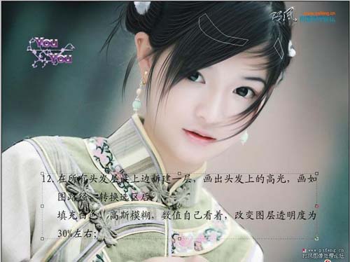 #p# 12、在所有头发层最上面新建一层,画出头发上的高光,画出如图路径,转换选区后填充白色,高斯模糊,数值自定,改变图层透明度为:30%左右。