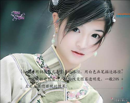 10、最后用钢笔勾几条主要的路径,用白色画笔描边路径,一定要新建图层,适当改变图层透明度,一般20%左右。