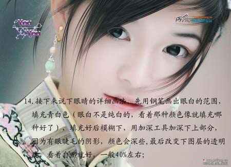 14、接下来说下眼睛的详细画法,先用钢笔画出眼白的范围,填充青白色(眼白不是纯白色的,看周哪种颜色像就填充哪种好了),填充好后模糊下,用加深工具加深上下部分,因为用眼睫毛的阴影,颜色会深些,最后改变下图层的透明度,看着自然就好,一般40%左右。