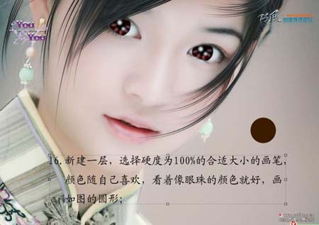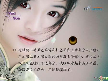 17、选择稍小的黑色画笔再棕色圆考上的部分点上瞳孔,用加深工具加深大圆的四周及上半部分,用减淡工具减淡黑色瞳孔下边部分,是眼珠看起来具立体感,加深减淡完成后,用滤镜模糊下。