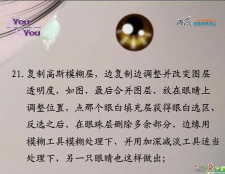 21、复制高斯模糊曾,边复制边调整并改变图层透明度,如图,最后合并图层,放在眼睛上调整位置,点那个眼白填充层获得眼白选区反选之后,在眼珠层删除多余部分,边缘用模糊工具模糊处理下,并用加深减淡工具适当处理下,另一只眼睛也这样做出。