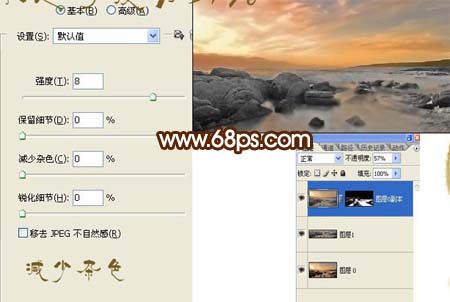 5、执行:滤镜 > 杂色 > 减少杂色,参数设置如下图,确定后执行:滤镜 > 模糊 > 高斯模糊,数值为2,加上图层蒙版擦出除湖水以外的部分。然后把图层不透明度改为:57%。