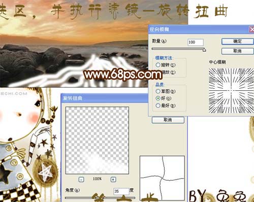 6、新建一个图层,用白色画笔在湖面上画出一条条的白线,然后执行:滤镜 > 模糊 > 径向模糊,参数设置如下图右上,确定后按Ctrl调出图层1的选区,再执行:滤镜 > 扭曲 > 旋转扭曲,参数设置如下图下。