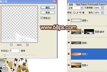 7、再执行:滤镜 > 其它 > 最大值,参数设置如下图左,确定后回到背景图层上,用矩形选框工具把天空部分狂选出来,按Ctrl J复制到新的图层,执行:编辑 > 变换 > 水平翻转。