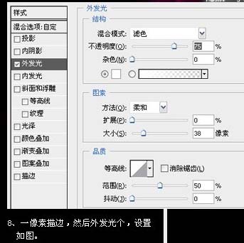 8、回到图层面板,描边一个像素,然后再设置外发光。