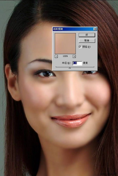 8.在上层皮肤上,用特殊模糊去斑,用高斯模糊柔化