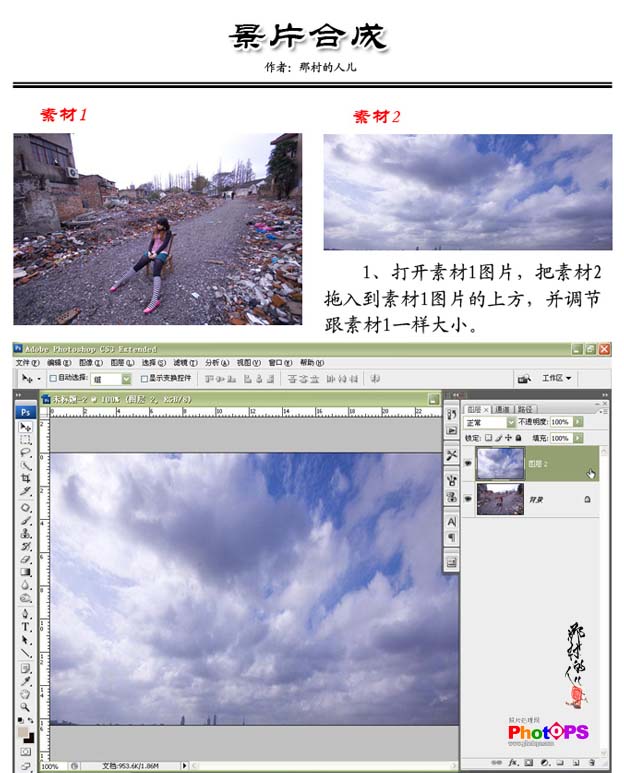1、打开素材1图片,把素材2拖入到素材1图片的上方,并调节跟素材1一样大小。