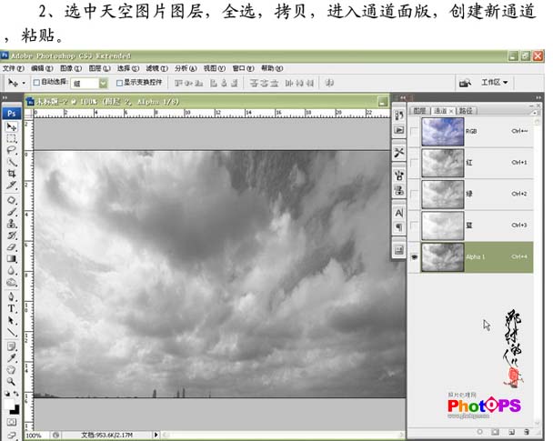 2、选中天空图片图层,按住Ctrl+A键全选,按住Ctrl+C拷贝,进入通道面版,创建新通道,Ctrl+V粘贴。