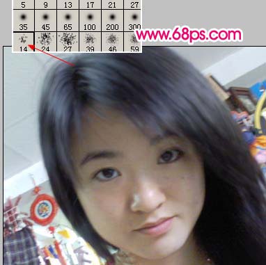 1、打开原图素材,按Ctrl J把背景图层复制一层,然后选择涂抹工具笔刷选择下图所示杂点较多的笔刷,压力为:50%左右,然后顺着人物头发涂抹,去掉头发上