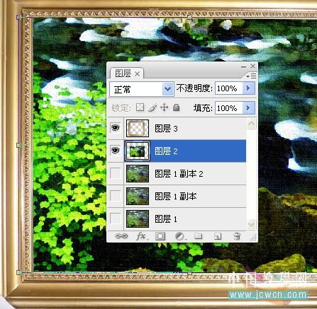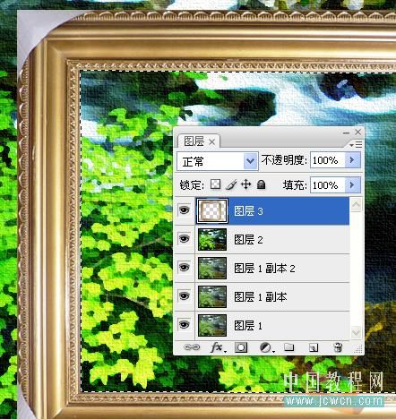 效果已经完成了,但好像还少点什么吧,对了油画一般都有漂亮的相框的哦,找个相框素材拉进来,魔棒点中间位置DEL删除