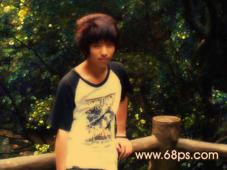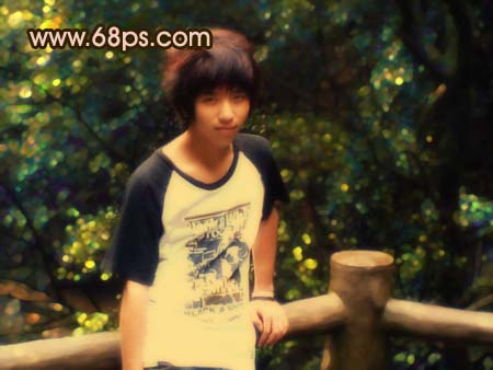 原图素材严重偏色及失真,处理起来比较麻烦。不过可以用滤镜效果把背景部分换成另外的形式,再整体调色及调光。