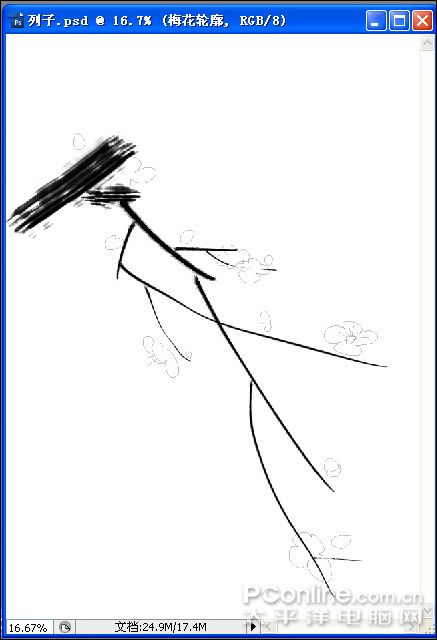 9、对照草图利用自由钢笔工具(快捷键)完成细枝的描绘,然后执行菜单:“图层”/“新建”/“图层”(快捷键Shift+Ctrl+N),新建图层并命名为:梅花轮廓,如图: