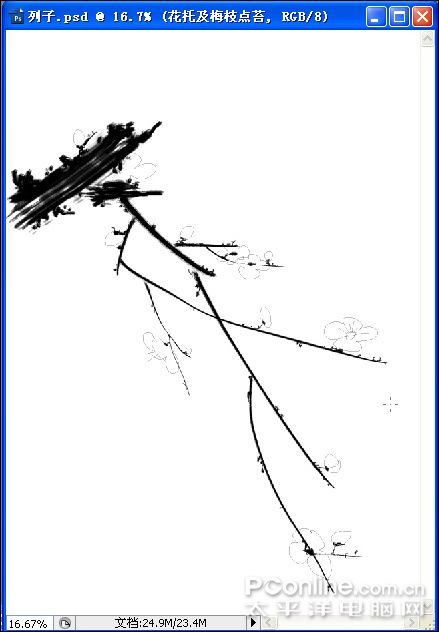 #p# 11、执行菜单:“图层”/“新建”/“图层”(快捷键Shift+Ctrl+N),新建图层并命名为:花托及梅枝点苔;选择工具箱中的画笔工具(快捷键B),右键在画布上点击弹出画笔选取器,选择尖角画笔,结合左右中括号键,一边调整画笔大小一边描绘花托及点苔,效果如图: