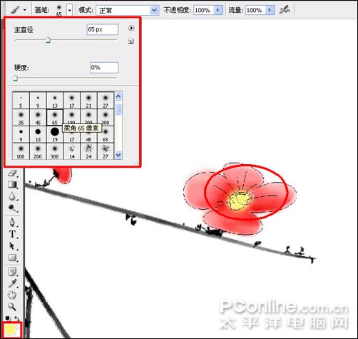 12、执行菜单:“图层”/“新建”/“图层”(快捷键Shift+Ctrl+N),新建图层并命名为:花朵颜色;拖动花朵颜色图层将其放置于主枝干图层之下,然后选择工具箱中的画笔工具(快捷键B),右键在画布上点击弹出画笔选取器,选择柔角画笔,再将前景色设置为红色,根据需要结合左右中括号键调节画笔大小,在花朵颜色图层上描绘出花朵颜色,如图: