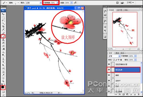 16、到了这一步,基本完成了整幅画的绘制;为了实现更真实的国画效果,下面我们来调整一下梅花花瓣轮廓;首先,选中梅花轮廓图层,选择工具箱中的画笔工具(快捷键B),前景色设置为黑色,右键在画布上点击弹出画笔选取器,选择柔角画笔,在菜单工具栏上不透明度设置为:50%,结合左右中括号键调整画笔大小,对花瓣轮廓进行调整描绘,让花瓣看起来更形象,如图16: