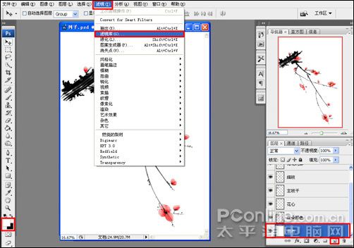 18、接下来,就是给国画梅花制作画纸,让其看起来像是画在纸上一样;首先,执行菜单:“图层”/“新建”/“图层”(快捷键Shift+Ctrl+N),新建图层并命名为:画布,将前景色设置为白色,按Alt+Delete组合键将画布图层填充为白色;然后执行菜单:“滤镜”/“滤镜库”,如图: