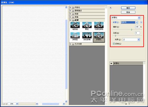 19、弹出纹理化窗口,选择纹理化,在纹理下拉列表中选择粗麻布,缩放为145%,凸现为4,光照为上,勾选反相(数值可自己设置),如图: