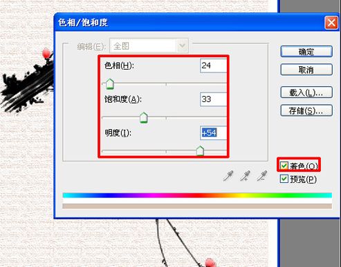 #p# 20、选中加了粗麻布滤镜的画布图层,按组合键Ctrl+U打开“色相/饱和度”对话框,首先勾选上着色选项, 然后色相设置为24,饱和度为33,明度为54,然后确定,如图: