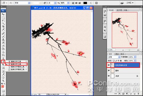 21、为了方便,简化图层数量,选中其中一个图层,按住Ctrl键不放,复选其它图层,把除画布和锁定的白色背景图层外的所有图层合并(快捷键Ctrl+E合并选中图层);然后为国画梅花题字,在工具箱中选择直排文字工具 (快捷键T),如图: