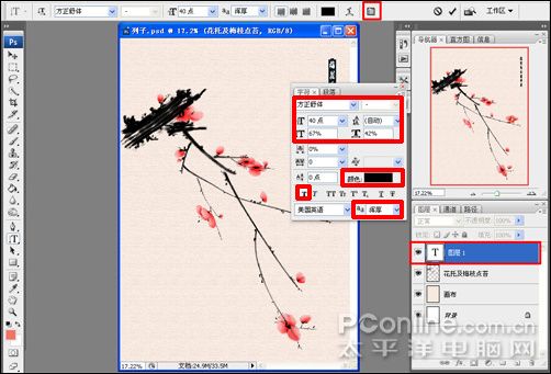22、在工具箱中选择直排文字工具(快捷键T)的状态下,在右上角处点击画面输入文字“梅花香自苦寒来”,在图层窗口会自动生成一个新建文字图层,之后鼠标点菜单工具栏上的“显示/隐藏字符和段落调板”图标,弹出字符/段落编辑窗口,设置字体系列为方正舒体,字体大小为40,行距为自动,垂直缩放67%,水平缩放42%,颜色为黑色,选择加粗,消除锯齿设置为浑厚,如图: