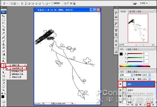 6、为了区分树枝的层次关系,执行菜单:“图层”/“新建”/“图层”(快捷键Shift+Ctrl+N),新建图层并命名为:细枝;然后选择工具箱中的自由钢笔工具(快捷键P),如图: