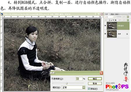 #p# 4、选择菜单:图像 > 模式 > RGB颜色,选择合拼,把背景图层复制一层,选择菜单:图像 > 调整 > 自动颜色,然后按Ctrl + Shift + F渐隐自动颜色,再减低图层的不透明度。
