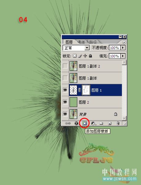 04、黑毛毛就抠出来了,但画面有点脏,把图放大到600%, 点击红圈处添加图层蒙版用黑画笔把它清理干净。
