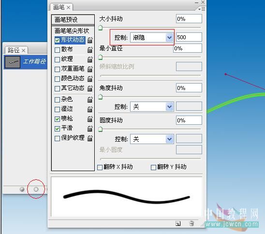 2、设置画笔大小为7XP,硬度100%,大小抖动为渐隐.后面的值需要根据具体情况设置,我没有好办法,一点点地试吧.呵呵.把前景色设为鲜绿色,点路径面板中的描边路径按钮。