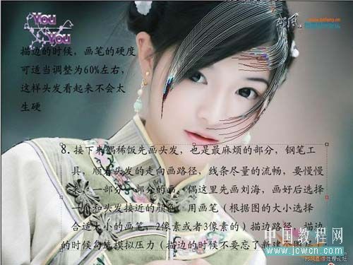 8、接下来画人物头发,用钢笔工具顺着头发走向画路径,线条尽量流畅,要慢慢画,一部分一部分的画,画好后选择一个和头发接近的颜色,用画笔描边路径,描边的时候勾选模拟压力。