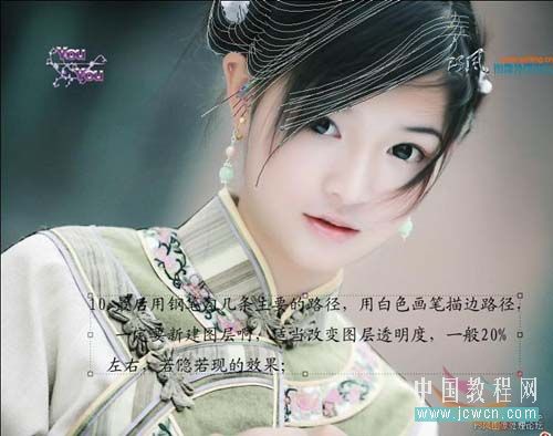 10、最后用钢笔勾几条主要的路径,用白色画笔描边路径,一定要新建图层,适当改变图层透明度,一般20%左右。