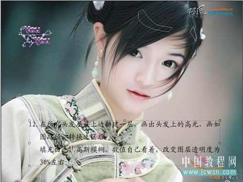 12、在所有头发层最上面新建一层,画出头发上的高光,画出如图路径,转换选区后填充白色,高斯模糊,数值自定,改变图层透明度为:30%左右。