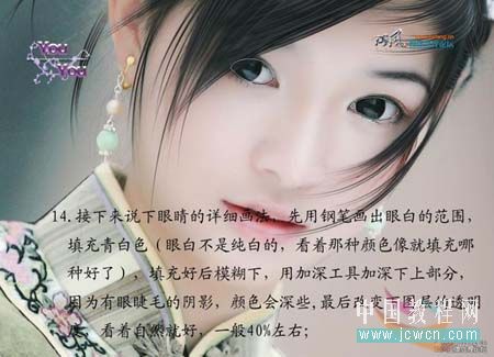 14、接下来说下眼睛的详细画法,先用钢笔画出眼白的范围,填充青白色(眼白不是纯白色的,看着哪种颜色像就填充哪种好了),填充好后模糊下,用加深工具加深上下部分,因为用眼睫毛的阴影,颜色会深些,最后改变下图层的透明度,看着自然就好,一般40%左右。