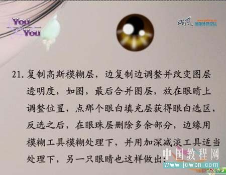 21、复制高斯模糊层,边复制边调整并改变图层透明度,如图,最后合并图层,放在眼睛上调整位置,点那个眼白填充层获得眼白选区反选之后,在眼珠层删除多余部分,边缘用模糊工具模糊处理下,并用加深减淡工具适当处理下,另一只眼睛也这样做出。