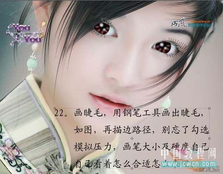 22、画睫毛,用钢笔工具画出睫毛,如图,再描边路径,别忘了勾选模拟压力,画笔的大小及硬度自己调整