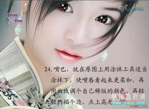 24、嘴巴的处理:就在原图上用涂抹工具适当涂抹下,使嘴唇看起来更柔和,再用曲线调个自己喜欢的颜色,再轻轻的描个边,点上高光,OK!