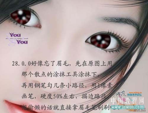 28、好像忘了眉毛,先在原图上用那个散点的涂抹工具涂抹下,再用钢笔勾几条小路径,用1像素画笔,硬度50%左右,描边路径,想偷懒的话就直接拿眉毛笔刷刷吧
