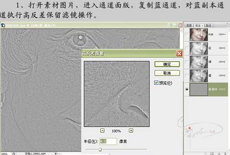 1、打开素材图片,点通道面,把蓝色通道复制一份,对蓝色副本执行:滤镜 > 其它 > 高反差保留,参数设置如下图。