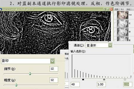 2、对蓝色副本通道执行:滤镜 > 素描 > 影印,参数设置如下图,确定后按Ctrl + I反相,再按Ctrl + L调整色阶,