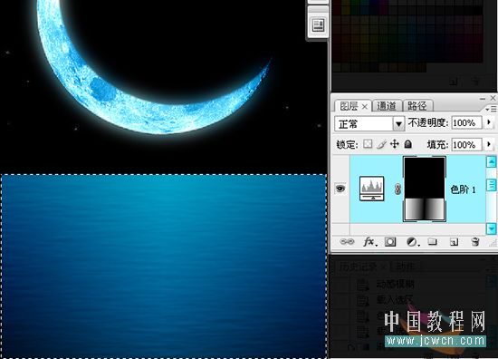 7.按住ctrl点击"色阶"调整层的蒙版,载入选区,然后在选区的地方,拉一条黑白的"对称渐变",使月亮下方的位置比较亮