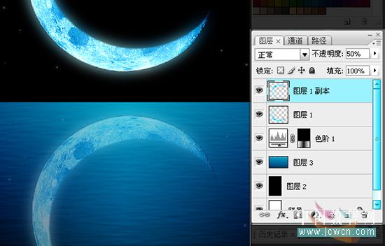 8.把图层1,月亮那层,ctrl+J,复制一个,"编辑"-"变换"-"垂直翻转",然后"移动"到下方,调图层的"不透明度"为50%,作为水上的月亮倒影