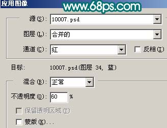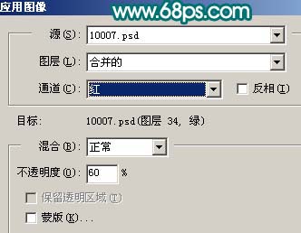 2、新建一个图层,按Ctrl + Alt + Shift + E盖印图层,然后点通道面板,选择绿色通道,执行:图像 > 应用图像,参数设置如图2,确定后再点蓝色通道,执行:图像 > 应用图像,参数设置如图3,然后回到图层面板,效果如图4。