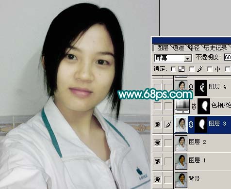 <图4> #p# 3、新建一个图层,盖印图层,把图层混合模式改为“滤色”,图层不透明度改为:60%,加上图层蒙版,只保留人物脸部及皮肤部分,其它地方用黑色画笔擦掉,效果如图5。