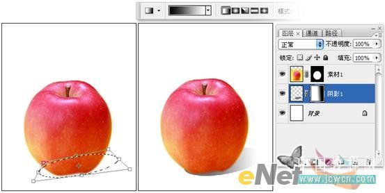 (4)绘制一个椭圆形选区,右键执行变换选区,将选区变换为苹果阴影的形状,填充阴影色,并为阴影添加一个图层蒙板,在蒙版中拉出黑白渐变,使阴影形成渐隐的效果,(这里解除蒙版与图层的链接后,左右移动蒙版,可以调节阴影的过度效果)。