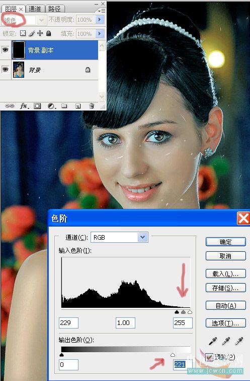 三、色阶这一步很关键,色阶滑块往右拉,并请随机预览调整的效果到自己满意为止