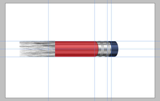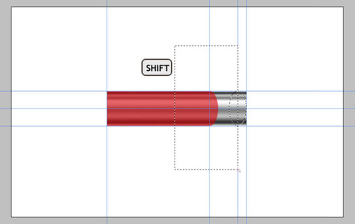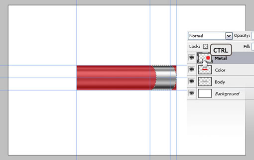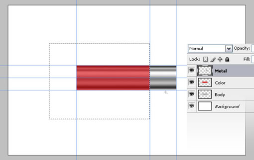 现在把“body”复制,并把复制的层放到所有层的最上面,取名“Metal”。接着拉出辅助线,拖到如图中的位置,靠右一些。然后选择矩形工具,把样式改为正常,框选出一块区域,右边贴紧辅助线,然后删除。