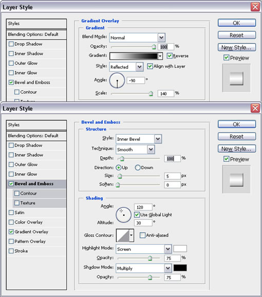 把新部分复制粘贴到一个新层上,取名“Bump”。给它的赋予斜面和浮雕、渐变叠加这些效果,具体数值如图。最后让它变得比“Metal”层略高些,用Ctrl+T,把高度设为102%,确定。