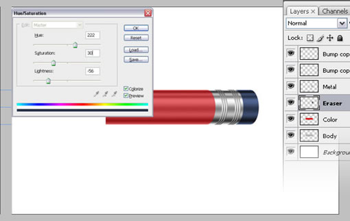 再次复制“Metal”层,取名“Shadow”,把它放到“Metal”层下面。打开“色相/饱和度”,把明度调到-100,再使用“滤镜-模糊-动感模糊”,角度为0,距离为5像素,然后应用它。现在,我们可以合并铅笔的金属部分,把“Metal”、“Shadow”、“Bump”合并。